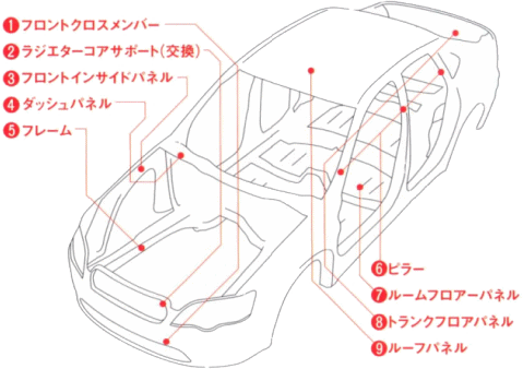 【ポイント】簡単にいうと上記の9箇所の部位を修復していなければ事故車にはなりません。 つまりドアを交換していようが、全塗装していようが修復歴車(事故車)とは言いません!