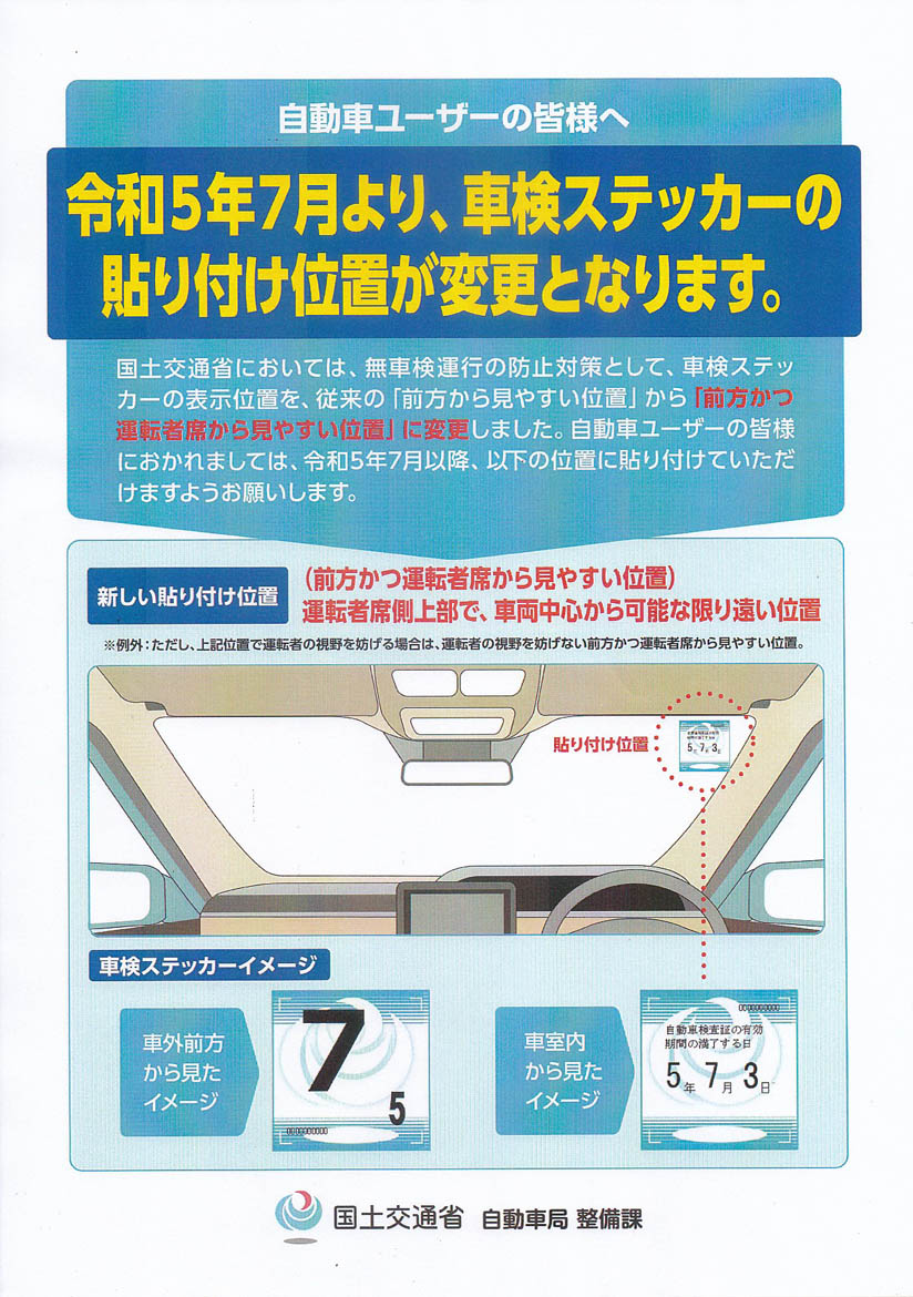 国土交通省においては、無車検運行の防止対策として、車検ステッカーの表示位置を、従来の「前方の見やすい位置」から「前方かつ運転者席から見やすい位置」に変更しました。自動車ユーザの皆様におかれましては、令和5年7月以降、以下の位置に張り付けていただけますようお願いいたします。
